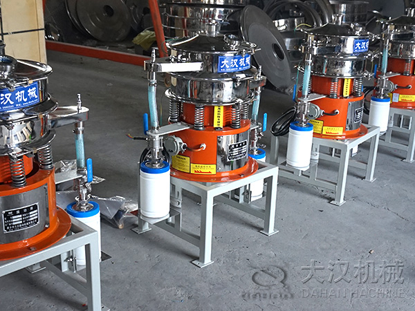 氣體保護(hù)振動(dòng)篩是利用超聲波清網(wǎng)的原理,在原有圓形旋振篩的基礎(chǔ)上加裝氣體保護(hù)裝置,采用立式振動(dòng)電機(jī)作為激振源,電機(jī)上、下兩端安裝有偏心重錘,將電機(jī)的旋轉(zhuǎn)運(yùn)動(dòng)轉(zhuǎn)變?yōu)樗健⒋怪?、傾斜的三次元運(yùn)動(dòng),再把這個(gè)運(yùn)動(dòng)傳遞給篩面,使超微細(xì)粉體接受巨大的超聲加速度,從而抑制粘附、摩擦、平降、楔入等堵網(wǎng)因素,提高篩分效率和清網(wǎng)效率。