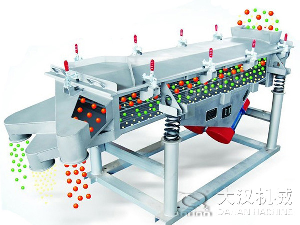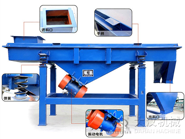 直線振動(dòng)篩,簡(jiǎn)稱直線篩,是一種運(yùn)動(dòng)軌跡為直線的中、細(xì)物料篩分設(shè)備,廣泛用于選煤、選礦、電力、制糖、制鹽、化工、磨料、耐材、食品等行業(yè),對(duì)中、細(xì)粒度物料進(jìn)行干、濕式篩分或脫水、脫介、脫泥作業(yè)。直線振動(dòng)篩利用振動(dòng)電機(jī)激振作為振動(dòng)源,使物料在篩網(wǎng)上被拋起,同時(shí)向前作直線運(yùn)動(dòng),物料從給料機(jī)均勻地進(jìn)入篩分機(jī)的進(jìn)料口,通過(guò)多層篩網(wǎng)產(chǎn)生數(shù)種規(guī)格的篩上物、篩下物、分別從各自的出口排出。具有耗能低、產(chǎn)量高、結(jié)構(gòu)簡(jiǎn)單、易維修、全封閉結(jié)構(gòu),無(wú)粉塵溢散,自動(dòng)排料,更適合于流水線作業(yè)。