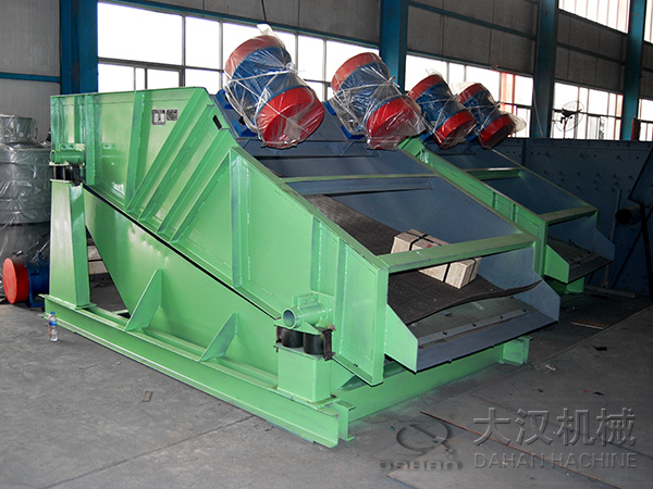 脫水篩主要由篩箱、激振器、支承系統(tǒng)及電機組成,采用了雙電機自同步技術,通用型偏心塊、可調(diào)振幅振動器。兩個互不聯(lián)系的振動器作同步反向運轉,兩組偏心質(zhì)量產(chǎn)生的離心力沿振動方向的分力疊加,反向離心抵消,從而形成單一的沿振動方向的激振動,使篩箱做作往復直線運動。