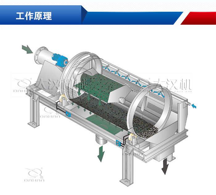 其電機(jī)經(jīng)減速器與滾筒裝置通過聯(lián)軸器連接在一起,驅(qū)動(dòng)滾筒裝置繞其軸線轉(zhuǎn)動(dòng)。當(dāng)物料進(jìn)入滾筒裝置后,由于滾筒裝置的傾斜與轉(zhuǎn)動(dòng),使篩面上的物料翻轉(zhuǎn)與滾動(dòng)的同時(shí),自上而下通過分級(jí)篩網(wǎng)析出,由于篩網(wǎng)規(guī)格不同,物料直接被分離篩選。從而使合格物料(篩下物)經(jīng)滾筒外圓的篩網(wǎng)排出,不合格的物料(篩上物))經(jīng)滾筒末端排出。由于物料在滾筒內(nèi)的翻轉(zhuǎn)、滾動(dòng),使卡在篩孔中的物料被彈出,可防止篩孔堵塞。