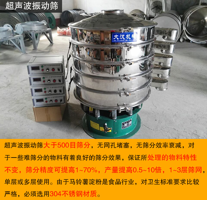 超聲波振動篩大于500目篩分,無網(wǎng)孔堵塞,無篩分效率衰減,對于一些難篩分的物料有著良好的篩分效果,保證所處理的物料特性不變,篩分精度可提高1~70%,產(chǎn)量提高0.5~10倍,1~3層篩網(wǎng),可單層或多層使用。超聲波振動篩特別適合高品質(zhì)、精細粉體的用戶使用。超聲波振動篩在馬鈴薯淀粉行業(yè)應用非常廣泛,由于是食品行業(yè)對衛(wèi)生標準要求比較嚴格,必須選用304不銹鋼材質(zhì)。
