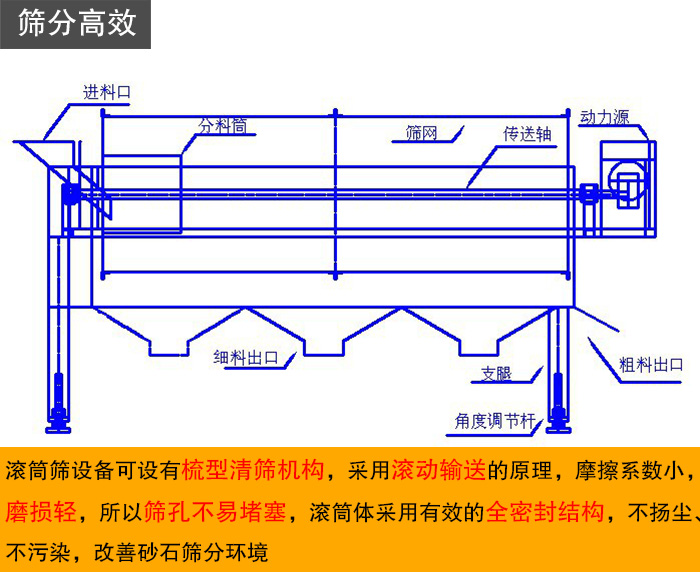滾筒篩是分選技術(shù)中應(yīng)用非常廣泛的一種振動篩,是通過對顆粒粒徑大小來控制垃圾分選的,分選精度高。滾筒篩的筒體一般分幾段,可視具體情況而定,篩孔由小到大排列,每一段上的篩孔孔徑相同。廣泛應(yīng)用于電廠、焦化廠、建材、冶金、化工、礦山等行業(yè)而研制的專用滾筒篩分機(jī)設(shè)備,可對砂石進(jìn)行高效篩分,篩下產(chǎn)品大小于100mm,中間10~50mm,細(xì)可達(dá) 3mm以下。