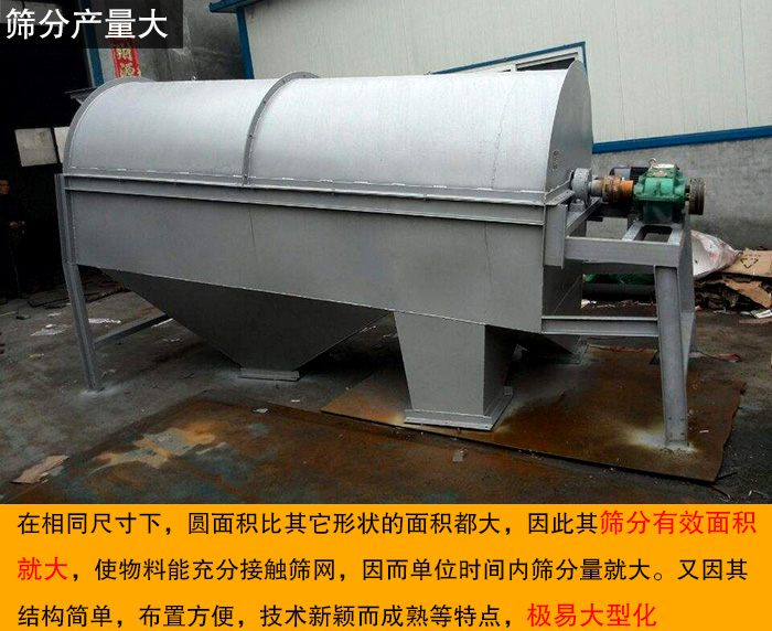 在相同尺寸下,圓面積比其它形狀的面積都大,因此其篩分有效面積就大,使物料能充分接觸篩網(wǎng),因而單位時間內(nèi)篩分量就大。又因其結(jié)構(gòu)簡單,布置方便,技術(shù)新穎而成熟等特點(diǎn),極易大型化。