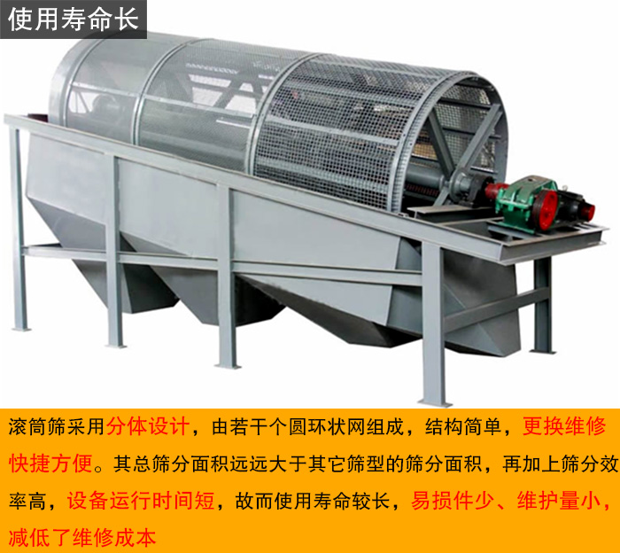 滾筒篩采用分體設(shè)計(jì),由若干個圓環(huán)狀網(wǎng)組成,結(jié)構(gòu)簡單,更換維修快捷方便。其總篩分面積遠(yuǎn)遠(yuǎn)大于其它篩型的篩分面積,再加上篩分效率高,設(shè)備運(yùn)行時間短,故而使用壽命較長,易損件少、維護(hù)量小,減低了維修成本。