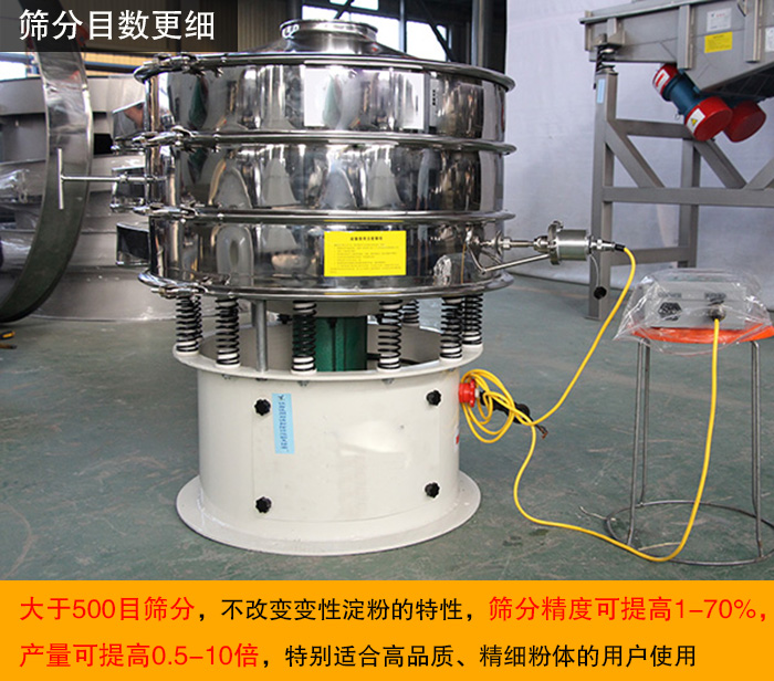 超聲波振動(dòng)篩將超聲波發(fā)生器與旋振篩結(jié)合在一起,將220V、50Hz或110V、60Hz電能轉(zhuǎn)化為18KHz的高頻電能,輸入超聲換能器,將其變成18KHz機(jī)械振動(dòng),大于500目篩分,不改變變性淀粉的特性,篩分精度可提高1-70%,產(chǎn)量可提高0.5-10倍,特別適合高品質(zhì)、精細(xì)粉體的用戶使用。