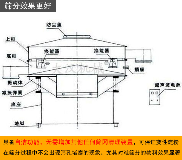 超聲波振動(dòng)篩是旋振篩的改良設(shè)備,是為了解決高精細(xì)粉末堵網(wǎng)問題而設(shè)計(jì)的,具備自潔功能,無(wú)需增加其他篩網(wǎng)清理裝置,可保證變性淀粉在篩分過(guò)程中不會(huì)出現(xiàn)篩孔堵塞的現(xiàn)象,尤其對(duì)難篩分的物料效果顯著。