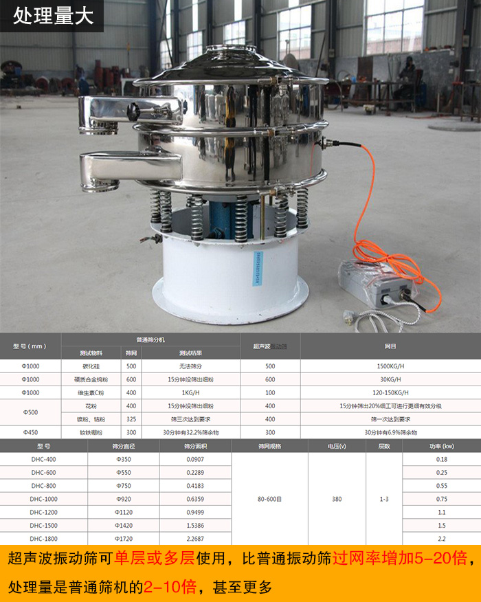 超聲波振動(dòng)篩可單層或多層使用,比普通振動(dòng)篩過(guò)網(wǎng)率增加5-20倍,處理量是普通篩機(jī)的2-10倍,甚至更多。