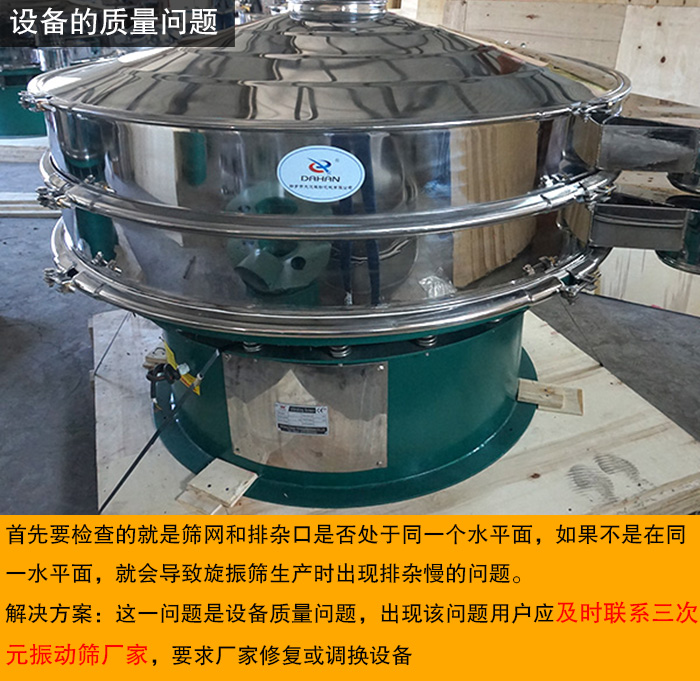 如果三次元振動(dòng)篩是剛購(gòu)買的情況下,就出現(xiàn)這樣的問(wèn)題,首先要檢查的就是篩網(wǎng)和排雜口是否處于同一個(gè)水平面,如果不是在同一水平面,就會(huì)導(dǎo)致旋振篩生產(chǎn)時(shí)出現(xiàn)排雜慢的問(wèn)題。這一問(wèn)題是設(shè)備質(zhì)量問(wèn)題,出現(xiàn)該問(wèn)題用戶應(yīng)及時(shí)聯(lián)系三次元振動(dòng)篩廠家,要求廠家修復(fù)或調(diào)換設(shè)備。