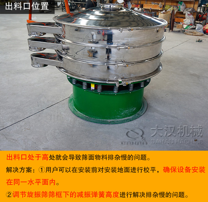 出料口處于高處就會(huì)導(dǎo)致篩面物料排雜慢的問(wèn)題。對(duì)于這一問(wèn)題用戶可以在安裝前對(duì)安裝地面進(jìn)行校平,確保設(shè)備安裝在同一水平面內(nèi)。另一個(gè)方法就是調(diào)節(jié)三次元振動(dòng)篩篩框下的減振彈簧高度進(jìn)行解決排雜慢的問(wèn)題。