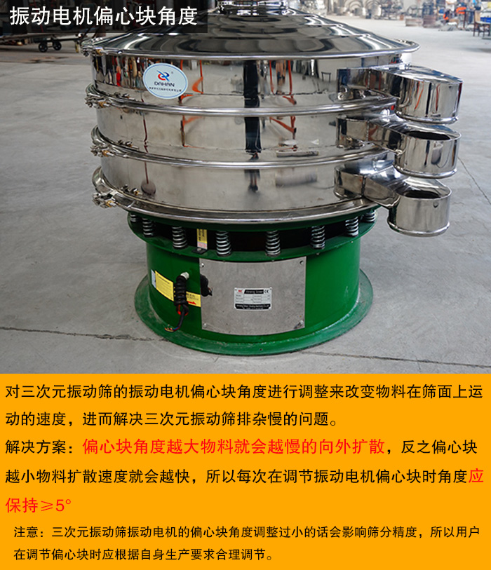 可以對(duì)三次元振動(dòng)篩的振動(dòng)電機(jī)偏心塊角度進(jìn)行調(diào)整來(lái)改變物料在篩面上運(yùn)動(dòng)的速度,進(jìn)而解決三次元振動(dòng)篩排雜慢的問(wèn)題。偏心塊角度越大物料就會(huì)越慢的向外擴(kuò)散,反之偏心塊越小物料擴(kuò)散速度就會(huì)越快,所以每次在調(diào)節(jié)振動(dòng)電機(jī)偏心塊時(shí)角度應(yīng)保持≥5°。需要注意的是,三次元振動(dòng)篩振動(dòng)電機(jī)的偏心塊角度調(diào)整過(guò)小的話會(huì)影響篩分精度,所以用戶在調(diào)節(jié)偏心塊時(shí)應(yīng)根據(jù)自身生產(chǎn)要求合理調(diào)節(jié)。