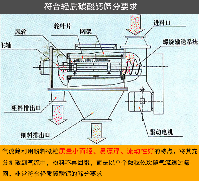 氣流篩利用粉料微粒質(zhì)量小而輕、易漂浮、流動(dòng)性好的特點(diǎn),將其充分?jǐn)U散到氣流中,粉料不再團(tuán)聚,而是以單個(gè)微粒依次隨氣流透過(guò)篩網(wǎng),非常符合輕質(zhì)碳酸鈣的篩分要求。