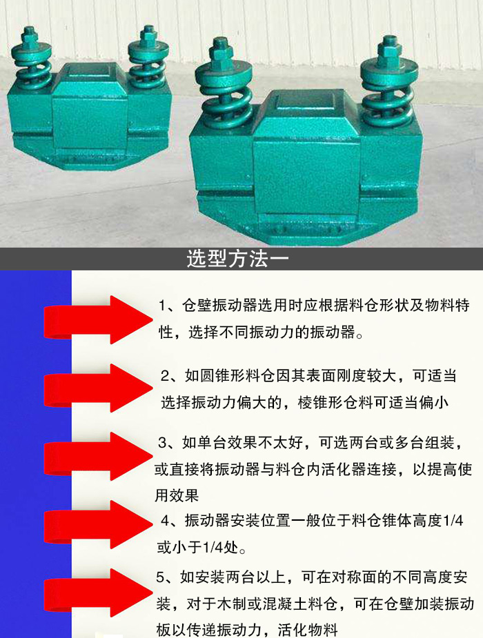 2、如圓錐形料倉因其表面剛度較大,可適當(dāng)選擇振動(dòng)力偏大的,棱錐形倉料可適當(dāng)偏小。