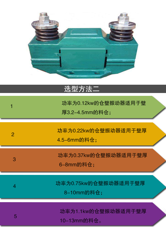 1、倉壁振動(dòng)器選用時(shí)應(yīng)根據(jù)料倉形狀及物料特性,選擇不同振動(dòng)力的振動(dòng)器。