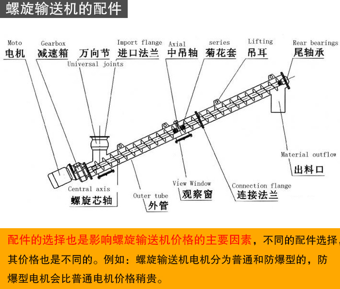 螺旋輸送機(jī)主要由料槽、螺旋葉片和轉(zhuǎn)動軸組成的螺旋體、兩端軸承、中間懸掛軸承及驅(qū)動裝置組成。配件的選擇也是影響螺旋輸送機(jī)價格的主要因素,不同的配件選擇,其價格也是不同的。例如:螺旋輸送機(jī)電機(jī)分為普通和防爆型的,防爆型電機(jī)會比普通電機(jī)價格稍貴。