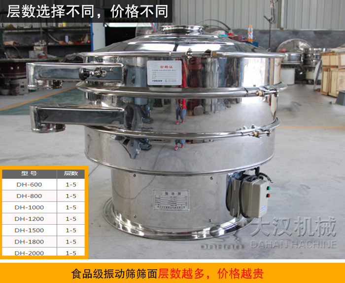 大漢機械推薦一款專門用于食品行業(yè)的振動篩,即食品振動篩,食品振動篩對衛(wèi)生標(biāo)準(zhǔn)要求比較嚴(yán)格,所以整機采用304不銹鋼材質(zhì)。該設(shè)備干凈、衛(wèi)生、無死角,全部進(jìn)行剖光處理,完全達(dá)到食品衛(wèi)生標(biāo)準(zhǔn)。新鄉(xiāng)大漢一臺食品振動篩價格在6000~15000元之間。但是不同型號、層數(shù)等不同,價格也會相應(yīng)有所變化。