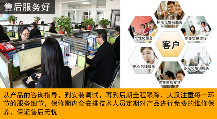 大漢公司采用一站式服務(wù)體系,從產(chǎn)品的咨詢指導,到安裝調(diào)試,再到后期全程跟蹤,大漢注重每一環(huán)節(jié)的服務(wù)細節(jié),致力于為客戶解決一切疑難問題,保修期內(nèi)會安排技術(shù)人員定期對產(chǎn)品進行免費的維修保養(yǎng),保證售后無憂。