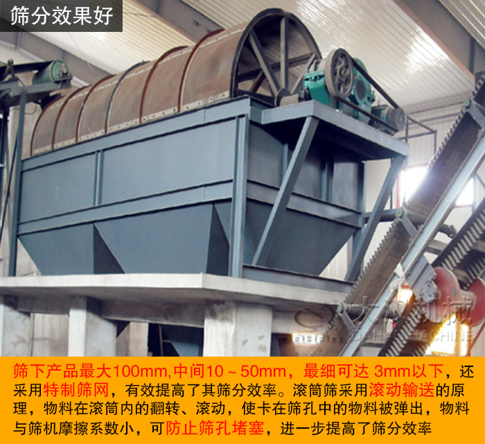 滾筒篩經(jīng)減速器與滾筒裝置通過(guò)聯(lián)軸器連接在一起,驅(qū)動(dòng)滾筒裝置繞其軸線轉(zhuǎn)動(dòng)。當(dāng)物料進(jìn)入滾筒裝置后,由于滾筒裝置的傾斜與轉(zhuǎn)動(dòng),使篩面上的物料翻轉(zhuǎn)與滾動(dòng)的同時(shí),自上而下通過(guò)分級(jí)篩網(wǎng)析出,由于篩網(wǎng)規(guī)格不同,物料直接被分離篩選,篩分效率高,篩下產(chǎn)品大100mm,中間10~50mm,細(xì)可達(dá) 3mm以下,還采用特制篩網(wǎng),有效提高了其篩分效率。滾筒篩采用滾動(dòng)輸送的原理,物料在滾筒內(nèi)的翻轉(zhuǎn)、滾動(dòng),使卡在篩孔中的物料被彈出,物料與篩機(jī)摩擦系數(shù)小,可防止篩孔堵塞,進(jìn)一步提高了篩分效率。