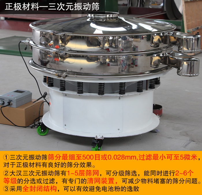 正極材料的鋰電池主要是鋰鐵磷酸鹽,多為顆粒狀,所以大漢推薦大家使用三次元振動(dòng)篩。