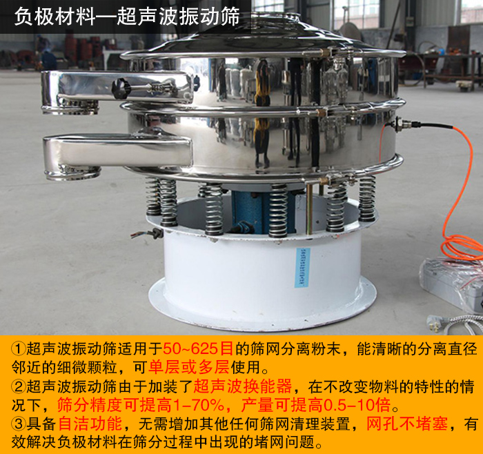 負(fù)極材料的鋰電池主要是石墨,是一種細(xì)度較高的物料,普通的振動(dòng)篩在實(shí)際篩分過程中會(huì)出現(xiàn)堵網(wǎng)等問題,所以大漢廠家推薦使用超聲波振動(dòng)篩進(jìn)行篩分。