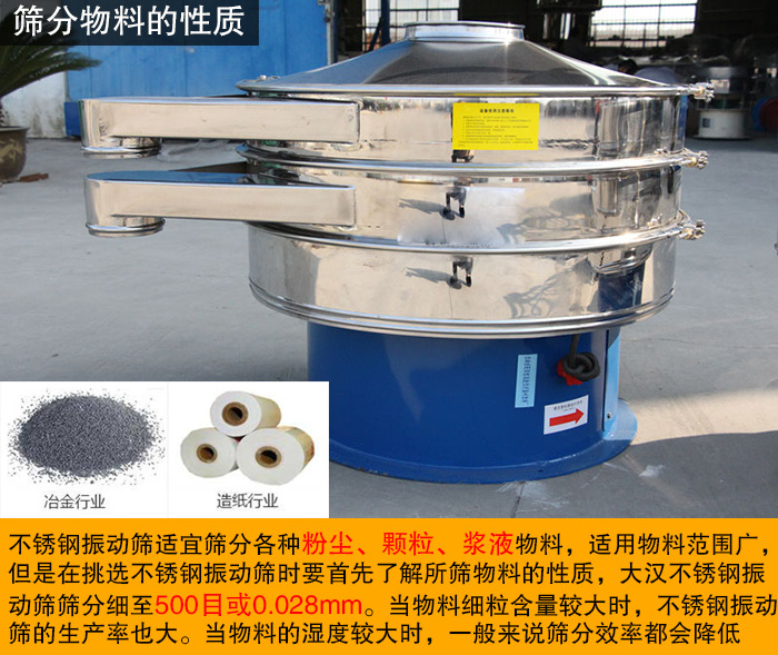 不銹鋼振動篩適宜篩分各種粉塵、顆粒、漿液物料,適用物料范圍廣,但是在挑選不銹鋼振動篩時要首先了解所篩物料的性質(zhì),大漢不銹鋼振動篩篩分細(xì)至500目或0.028mm。當(dāng)物料細(xì)粒含量較大時,不銹鋼振動篩的生產(chǎn)率也大。當(dāng)物料的濕度較大時,一般來說篩分效率都會降低。