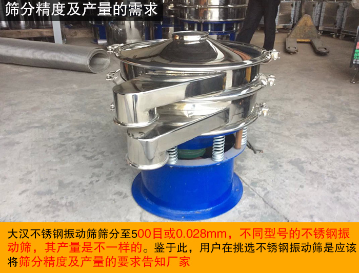 不同的用戶,很多情況下對物料的篩分精度及處理量要求也不同,用戶的篩分精度和處理量要求也是不銹鋼振動篩選型的重要參考。大漢不銹鋼振動篩篩分至500目或0.028mm,不同型號的不銹鋼振動篩,其產(chǎn)量是不一樣的。鑒于此,用戶在挑選不銹鋼振動篩是應(yīng)該將篩分精度及產(chǎn)量的要求告知廠家,以便廠家為您推薦跟適合您的不銹鋼振動篩設(shè)備。