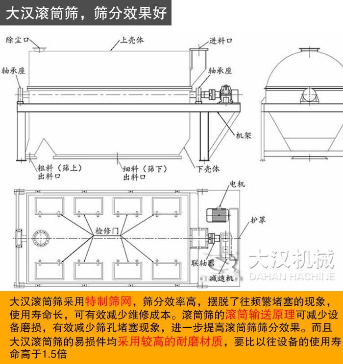 一件設(shè)備都是用來服務(wù)生產(chǎn)的,大漢滾筒篩采用特制篩網(wǎng),篩分效率高,擺脫了往頻繁堵塞的現(xiàn)象,使用壽命長(zhǎng),可有效減少維修成本。滾筒篩的滾筒輸送原理可減少設(shè)備磨損,有效減少篩孔堵塞現(xiàn)象,進(jìn)一步提高滾筒篩篩分效果。而且大漢滾筒篩的易損件均采用較高的耐磨材質(zhì),要比以往設(shè)備的使用壽命高于1.5倍。