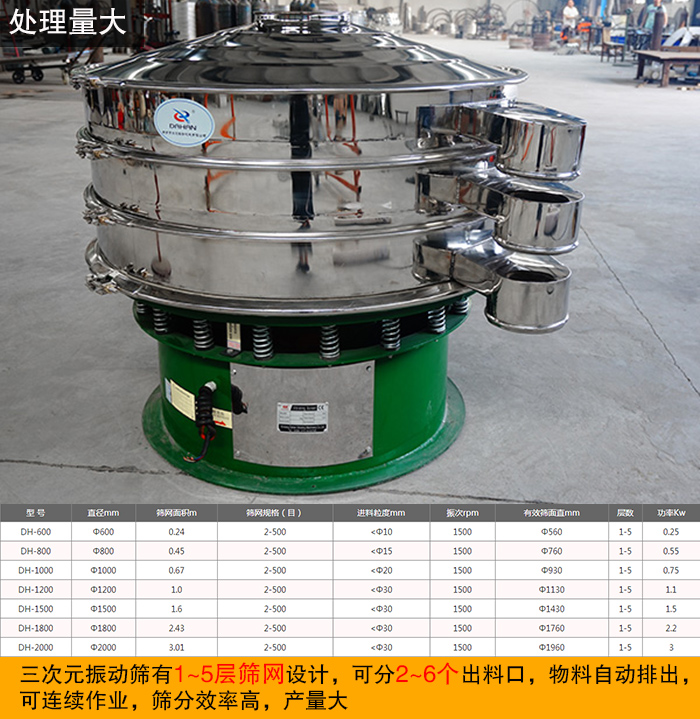 三次元振動篩有1~5層篩網(wǎng)設(shè)計(jì),可分2~6個出料口,物料自動排出,可連續(xù)作業(yè),篩分效率高,產(chǎn)量大,可滿足不同用戶對調(diào)味品產(chǎn)量的要求。