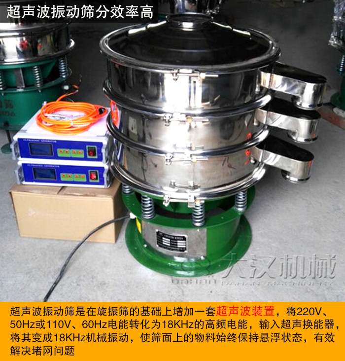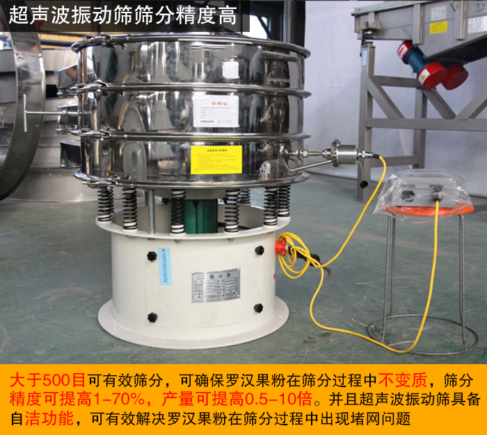 由于羅漢果粉易吸潮,且有粘性,使用普通旋振篩極易出現(xiàn)堵網(wǎng)的現(xiàn)象,所以大漢廠家推薦大家使用超聲波振動篩。