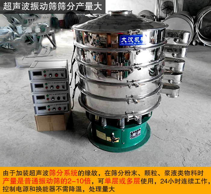 超聲波振動篩由于加裝超聲波篩分系統(tǒng)的緣故,在篩分粉末、顆粒、漿液類物料時(shí)產(chǎn)量是普通振動篩的2-10倍,可單層或多層使用,24小時(shí)連續(xù)工作,控制電源和換能器不需降溫,處理量大。