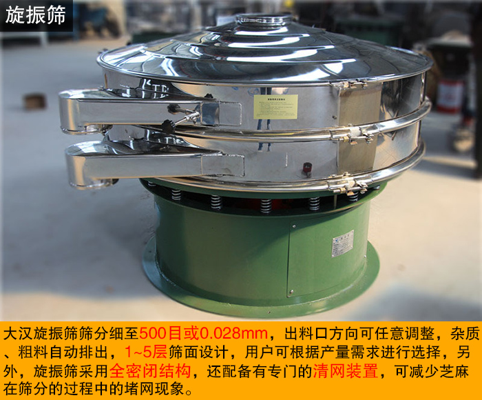 大漢旋振篩篩分細(xì)至500目或0.028mm,是一種高精度細(xì)粉篩分設(shè)備,出料口方向可任意調(diào)整,雜質(zhì)、粗料自動排出,可連續(xù)作業(yè),1~5層篩面設(shè)計,用戶可根據(jù)產(chǎn)量需求進行選擇,另外,旋振篩采用全密閉結(jié)構(gòu),還配備有專門的清網(wǎng)裝置,可減少芝麻在篩分的過程中的堵網(wǎng)現(xiàn)象,極大的提高了篩機的篩分產(chǎn)量和篩分效率。