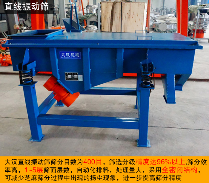 大漢直線振動篩篩分目數(shù)為400目,篩選分級精度達96%以上,篩分效率高,1~5層篩面層數(shù),自動化排料,處理量大,采用全密閉結(jié)構(gòu),可減少芝麻篩分過程中出現(xiàn)的揚塵現(xiàn)象,進一步提高篩分精度。