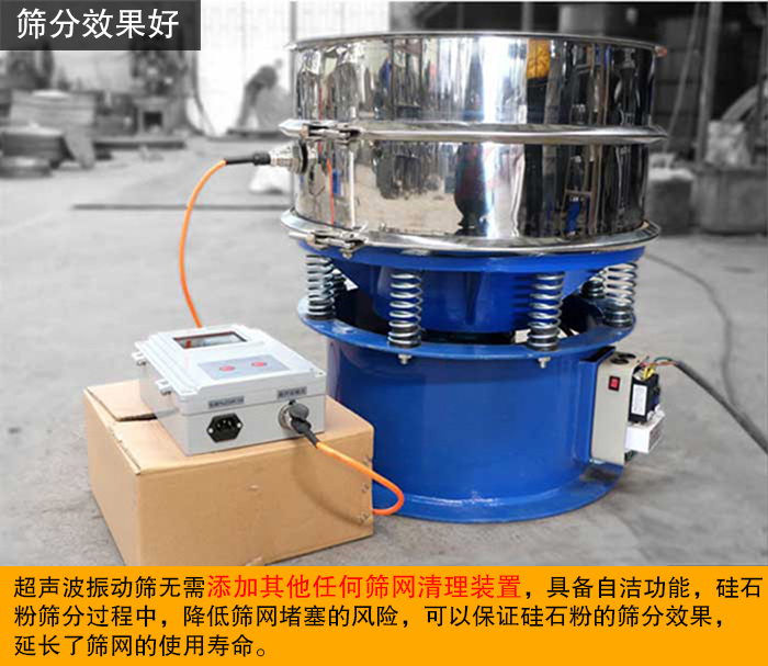 超聲波振動篩是將220V、50Hz或110V、60Hz電能轉(zhuǎn)化為18KHz的高頻電能,輸入超聲換能器,將其變成18KHz機械振動,大大提高了振動篩的各種效果,從而達到高效篩分和清網(wǎng)的目的。超聲波振動篩無需添加其他篩網(wǎng)清理裝置,具備自潔功能,硅石粉篩分過程中,降低篩網(wǎng)堵塞的風(fēng)險,可以保證硅石粉的篩分效果,延長了篩網(wǎng)的使用壽命。