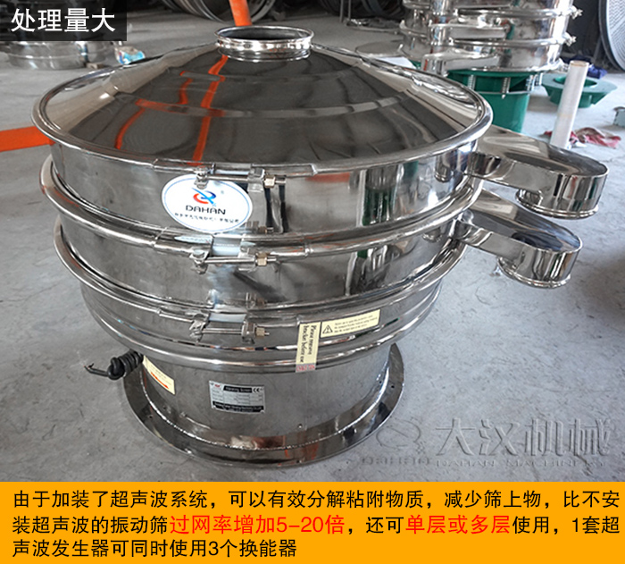 超聲波振動篩由于加裝了超聲波系統(tǒng),可以有效分解粘附物質(zhì),減少篩上物,比不安裝超聲波的振動篩過網(wǎng)率增加5-20倍,還可單層或多層使用,1套超聲波發(fā)生器可同時使用3個換能器。