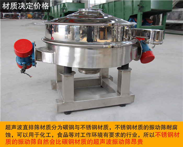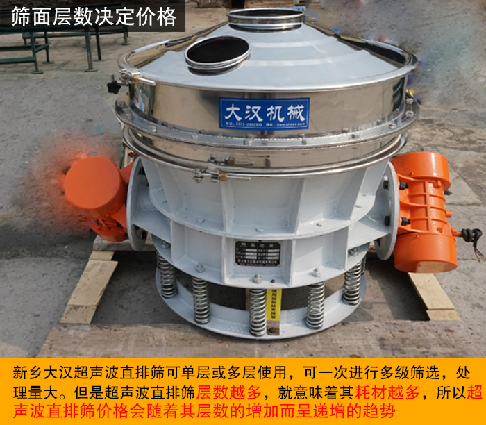 超聲波直排篩超聲波直排篩是在直排篩的基礎(chǔ)上加裝超聲波裝置,用于篩分較細(xì) 、易堵網(wǎng)、篩下物較多的物料篩分,其篩分精度高,篩分效率高,適用于冶金、制藥、化工、食品等多個(gè)行業(yè)。那么如果用戶想求購(gòu)一臺(tái)超聲波振動(dòng)篩得多少錢呢?新鄉(xiāng)大漢一臺(tái)超聲波振動(dòng)篩大概在8000~25000元之間,超聲波直排篩型號(hào)不同,材質(zhì)不同、篩面層數(shù)不同,所以價(jià)格也會(huì)有所波動(dòng),接下來(lái)將為您進(jìn)行詳細(xì)介紹。