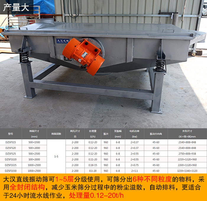 大漢直線振動(dòng)篩可1~5層分級(jí)使用,可篩分出6種不同粒度的物料,采用全封閉結(jié)構(gòu),減少玉米篩分過程中的粉塵溢散,自動(dòng)排料,更適合于24小時(shí)流水線作業(yè),處理量0.12-20t/h。