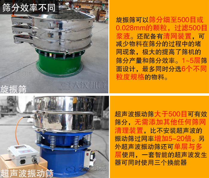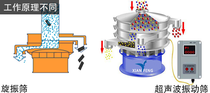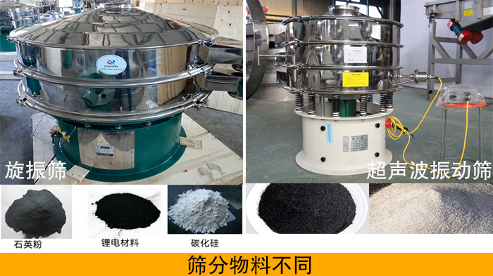 超聲波振動篩是在旋振篩基礎(chǔ)上及加裝超聲波裝置,因此相比旋振篩更加適合于粒度更細、粘度更大、易結(jié)團、高靜電、高精細、高密度、比重輕的粉狀物料,大于500目篩分。