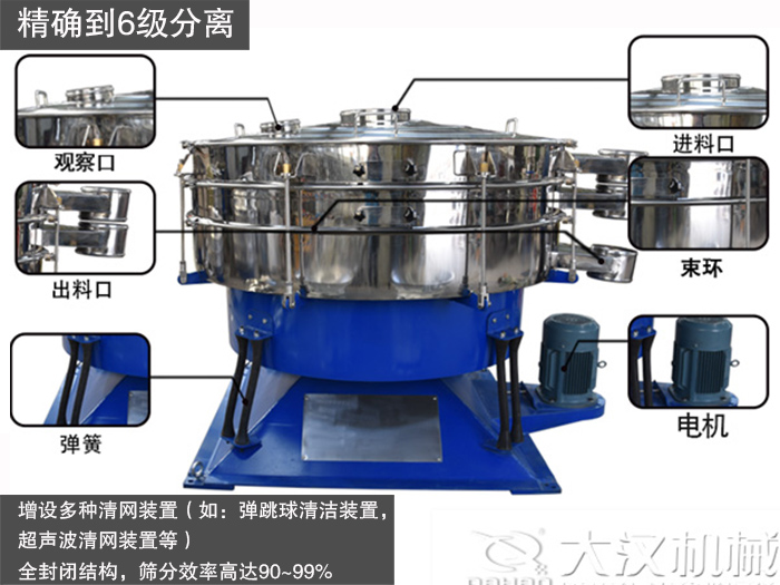 圓形搖擺篩可到6級分離,另外,還可增設(shè)多種清網(wǎng)裝置(如:彈跳球清潔裝置,超聲波清網(wǎng)裝置等),可有效解決篩面堵塞問題,確保篩分的連續(xù)性,采用全封閉結(jié)構(gòu),減少對環(huán)境的污染,篩分效率高達(dá)90~99%。