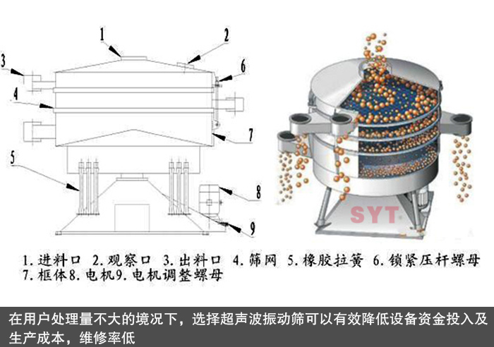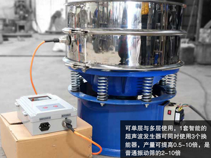 超聲波振動(dòng)篩可單層與多層使用,1套智能的超聲波發(fā)生器可同時(shí)使用3個(gè)換能器,產(chǎn)量可提高0.5~10倍,是普通振動(dòng)篩的2-10倍。
