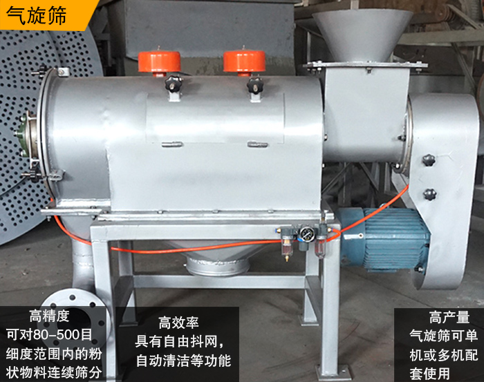 氣旋篩是專門微細粉進行高精度篩分的振動篩設(shè)備。氣旋篩篩網(wǎng)為圓筒狀,置于機體內(nèi)部,當(dāng)山楂粉通過螺旋輸送系統(tǒng)后,和氣流混合、霧化進入氣旋篩網(wǎng)筒內(nèi),然后通過網(wǎng)筒內(nèi)風(fēng)輪葉片使山楂粉同時受離心力和旋風(fēng)推進力,迫使山楂粉噴射過網(wǎng),由細料排出口排出,不能過網(wǎng)的山楂粉沿網(wǎng)筒壁從粗料排出口排出,從而達到去除雜質(zhì)的效果。