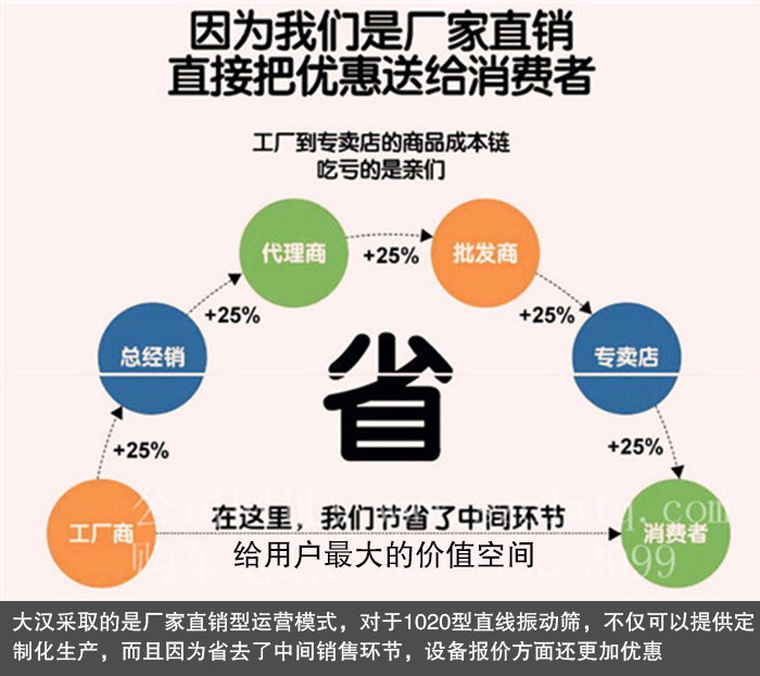 大漢采取的是廠家直銷型運(yùn)營(yíng)模式,對(duì)于1020型直線振動(dòng)篩,不僅可以提供定制化生產(chǎn),而且因?yàn)槭∪チ酥虚g銷售環(huán)節(jié),設(shè)備報(bào)價(jià)方面還更加優(yōu)惠,保證讓您以較低的價(jià)格購(gòu)得滿意的直線振動(dòng)篩設(shè)備。