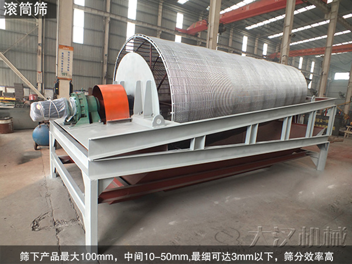 滾筒篩電動機經(jīng)減速器與滾筒裝置通過聯(lián)軸器連接在一起,驅動滾筒裝置繞其軸線轉動。當化肥進入滾筒裝置后,由于滾筒裝置的傾斜與轉動,使篩面上的化肥翻轉與滾動的同時,自上而下通過分級篩網(wǎng)析出,由于篩網(wǎng)規(guī)格不同,化肥被分離篩選,合格物料(篩下物)經(jīng)滾筒外圓的篩網(wǎng)排出,不合格的物料(篩上物))經(jīng)滾筒末端排出。篩下產(chǎn)品大100mm,中間10-50mm,細可達3mm以下,篩分效率高。