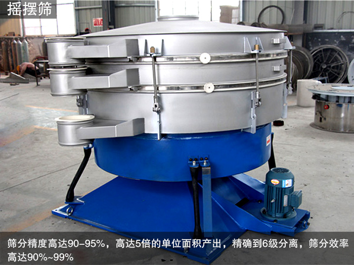 搖擺篩基本的回轉運動與人工篩分相類似,搖擺篩接通電源后篩體啟動,篩箱在振動裝置的驅動下作近似圓周運動,此時篩箱帶動整個篩面做周期性運動,篩面上的物料隨著篩箱在篩網(wǎng)上做定向跳躍式運動,在此過程中,小于篩網(wǎng)孔徑的物料落到篩網(wǎng)下層,從下出料口排出,大于篩網(wǎng)孔徑的物料從上出料口排出,中間層則從中出料口排出。搖擺篩有效模仿人工篩分動作和過程,篩分精度高達90-95%,高達5倍的單位面積產(chǎn)出,可進行6級分離,篩分效率高達90%~99%。