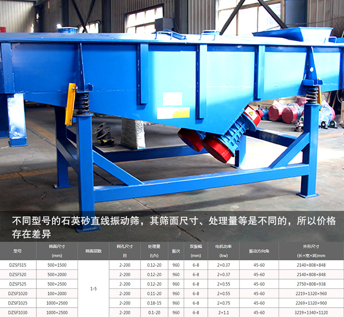 大漢石英砂直線振動篩型號包括DZSF515、DZSF520、DZSF525、DZSF1020、DZSF1025、DZSF1030多種型號,不同型號的石英砂直線振動篩,其篩面尺寸、處理量等是不同的,所以價格存在差異,用戶需要更加產(chǎn)能大小進(jìn)行合理選擇。