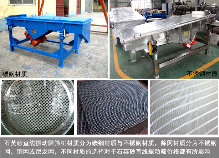 石英砂直線振動篩篩機材質(zhì)分為碳鋼材質(zhì)與不銹鋼材質(zhì),篩網(wǎng)材質(zhì)分為不銹鋼網(wǎng),銅網(wǎng)或尼龍網(wǎng)。不同材質(zhì)的選擇對于石英砂直線振動篩價格都有所影響,具體情況需要結(jié)合用戶實際選情況進(jìn)行選擇。