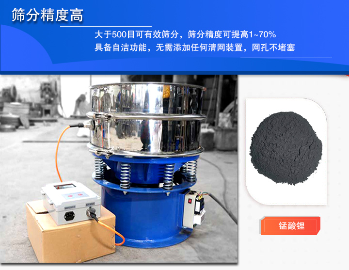 大漢超聲波振動篩大于500目可有效篩分,能清晰的分離直徑鄰近的細微顆粒,在不改變物料的特性的情況下,篩分精度可提高1~70%,具備自潔功能,無需添加清網(wǎng)裝置,網(wǎng)孔不堵塞。采用全密閉結(jié)構(gòu),可保證錳酸鋰在篩分過程中不被污染,進一步提高了其篩分精度。