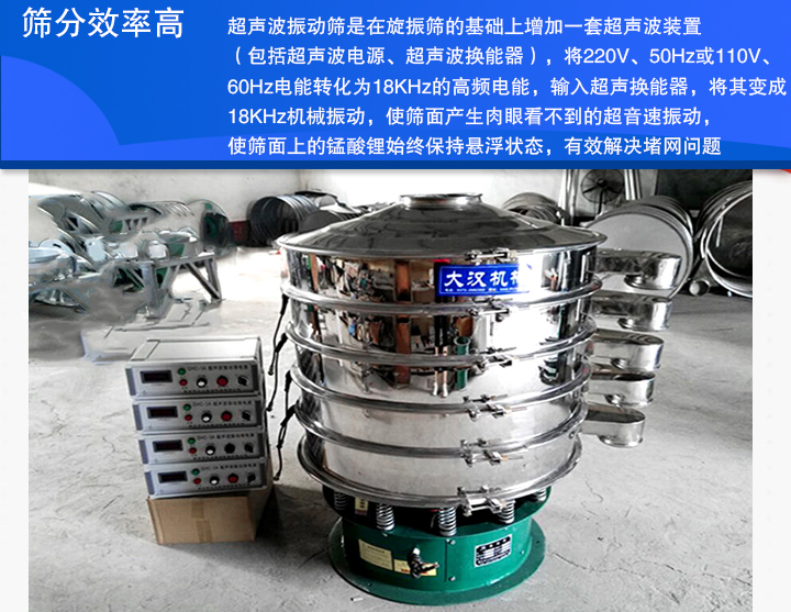 超聲波振動篩是在旋振篩的基礎上增加一套超聲波裝置(包括超聲波電源、超聲波換能器),將220V、50Hz或110V、60Hz電能轉(zhuǎn)化為18KHz的高頻電能,輸入超聲換能器,將其變成18KHz機械振動,使篩面產(chǎn)生肉眼看不到的超音速振動,使篩面上的錳酸鋰始終保持懸浮狀態(tài),有效地解決錳酸鋰強吸附性、易團聚、高靜電、高精細、輕比重等篩分難題。