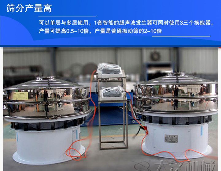 超聲波振動篩可以單層與多層使用,1套智能的超聲波發(fā)生器可同時使用3三個換能器,產(chǎn)量可提高0.5~10倍,產(chǎn)量是普通振動篩的2-10倍。