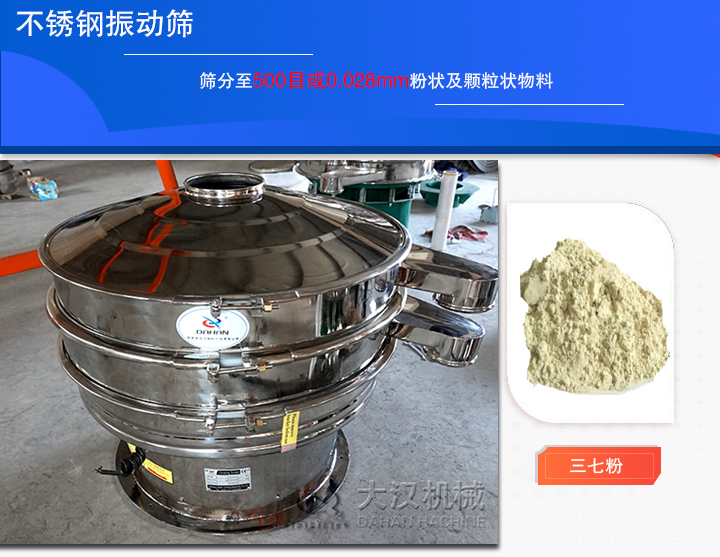 不銹鋼振動篩可篩分至500目或0.028mm粉狀及顆粒狀物料,可滿足三七粉行業(yè)粉篩分精度的要求。