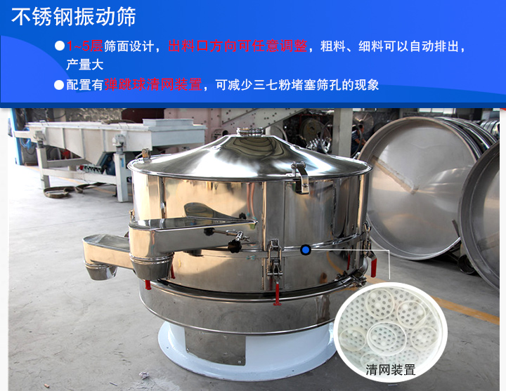 不銹鋼振動篩1~5層篩面設計,出料口方向可任意調整,粗料、細料可以自動排出,產量大。另外,不銹鋼振動篩還配置有彈跳球清網(wǎng)裝置,可減少三七粉堵塞篩孔的現(xiàn)象,進一步提高了其篩分效率。