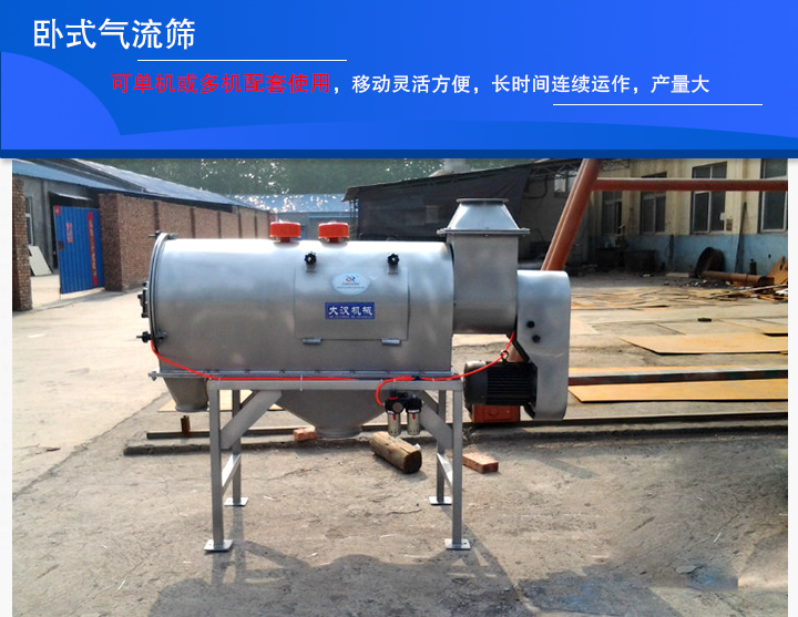 臥式氣流篩可單機或多機配套使用,移動靈活方便,長時間連續(xù)運作,產量大。